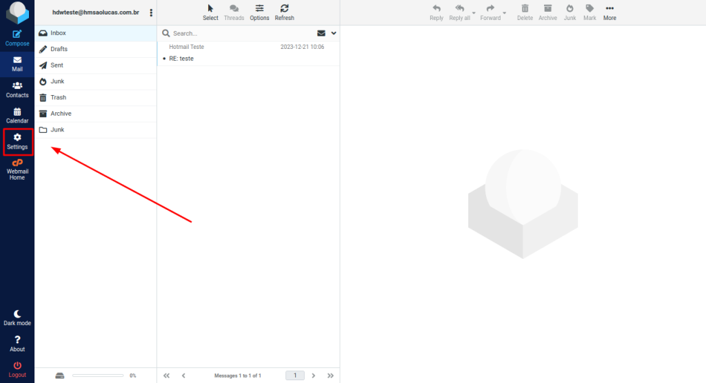 1 – Ao acessar seu webmail clique em “Configurações”